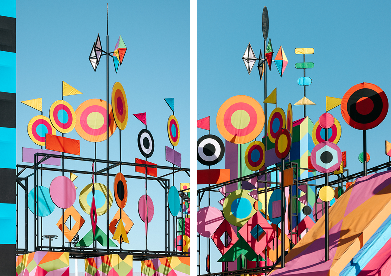 Myerscough emphasizes the natural beauty of the sky as part of the work, framing and lighting the active space to create a fantastical mesmerising environment — a geometric fairytale chock full of familiar shapes and colors that make everybody feel welcome and at ease.