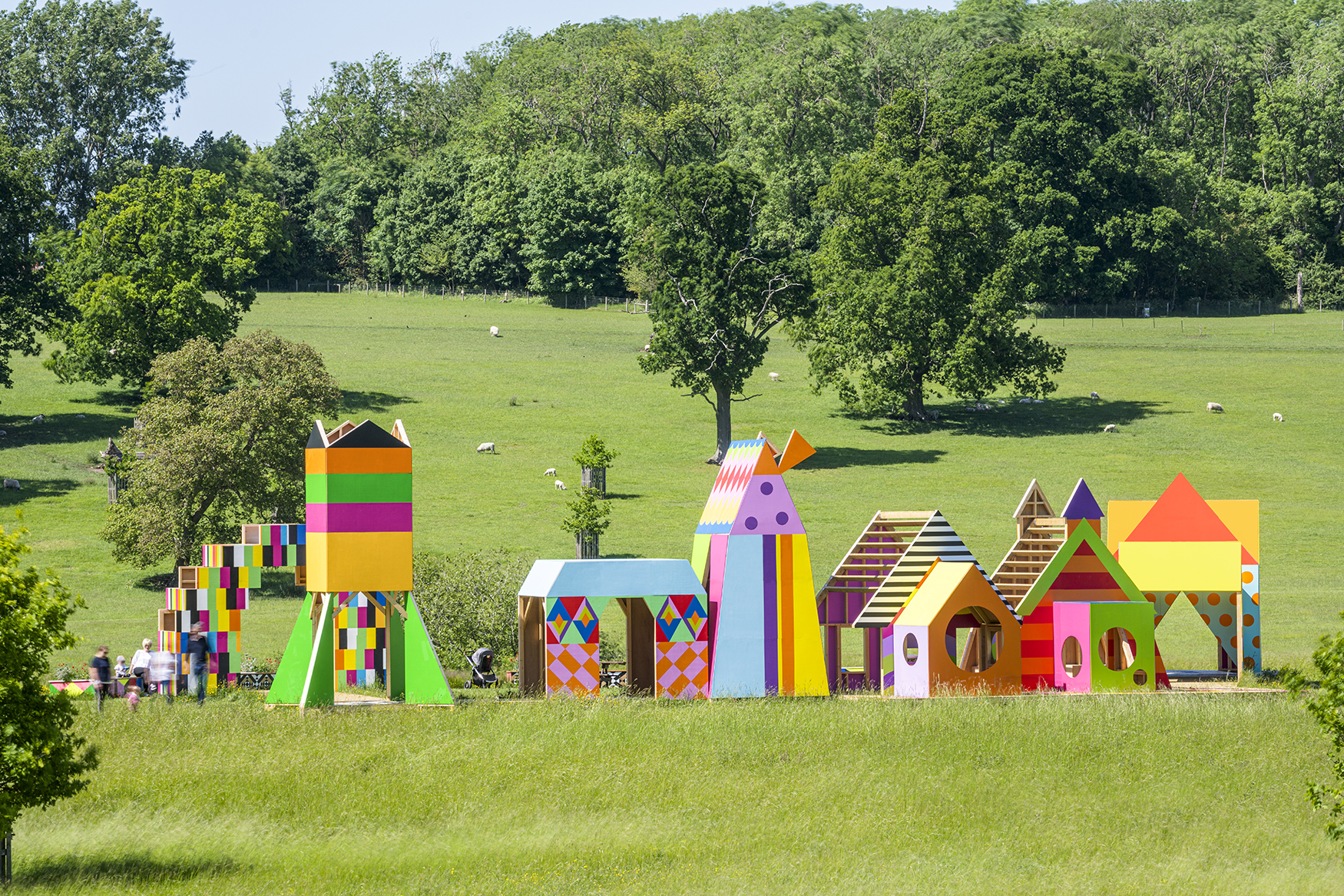 When visiting Myerscough was inspired by her surroundings and the energy and history of the building and the incredible Folk Art Collection. In the spirit of Folk art Myerscough called upon the surrounding community and held workshops with schools and visitors where they drew dwellings and buildings which went on to form the basis of 'The Village'. Once Myerscough designed 'The Village' was the community and everybody at the museum got involved and painted all the panels on site at Compton Verney